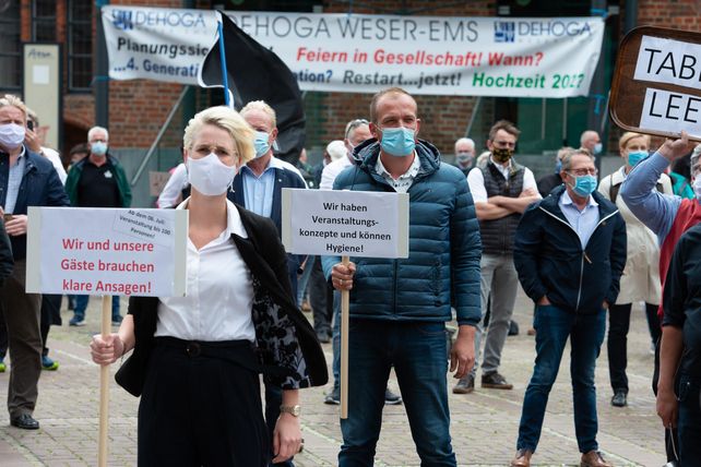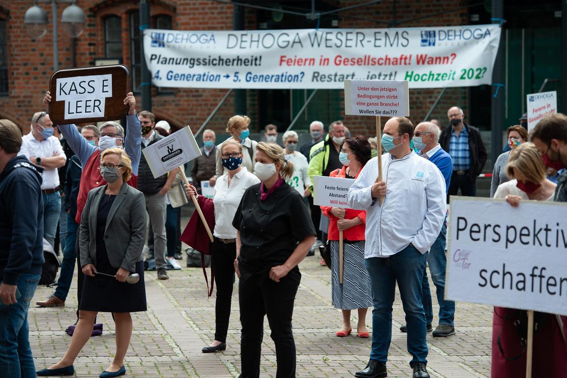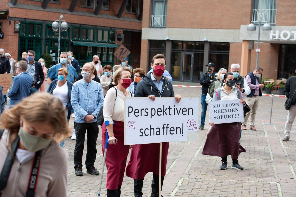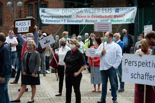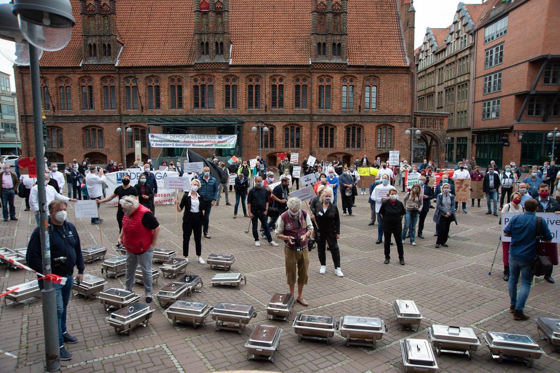 Etwa 300 Gastwirte und Hoteliers aus ganz Niedersachsen machten auf einer Kundgebung an der Hannoverschen Marktkirche ihren Sorgen aufgrund der coronabedingten Einschränkungen Luft. Stellvertretend für alle gastronomischen Betriebe in Niedersachsen, es waren nur 300 Teilnehmer von der Versammlungsbehörde zugelassen worden, rückten sie bei einer Kundgebung ihre existentiellen Nöte in den Mittelpunkt:
