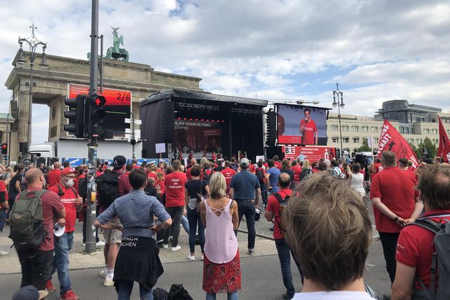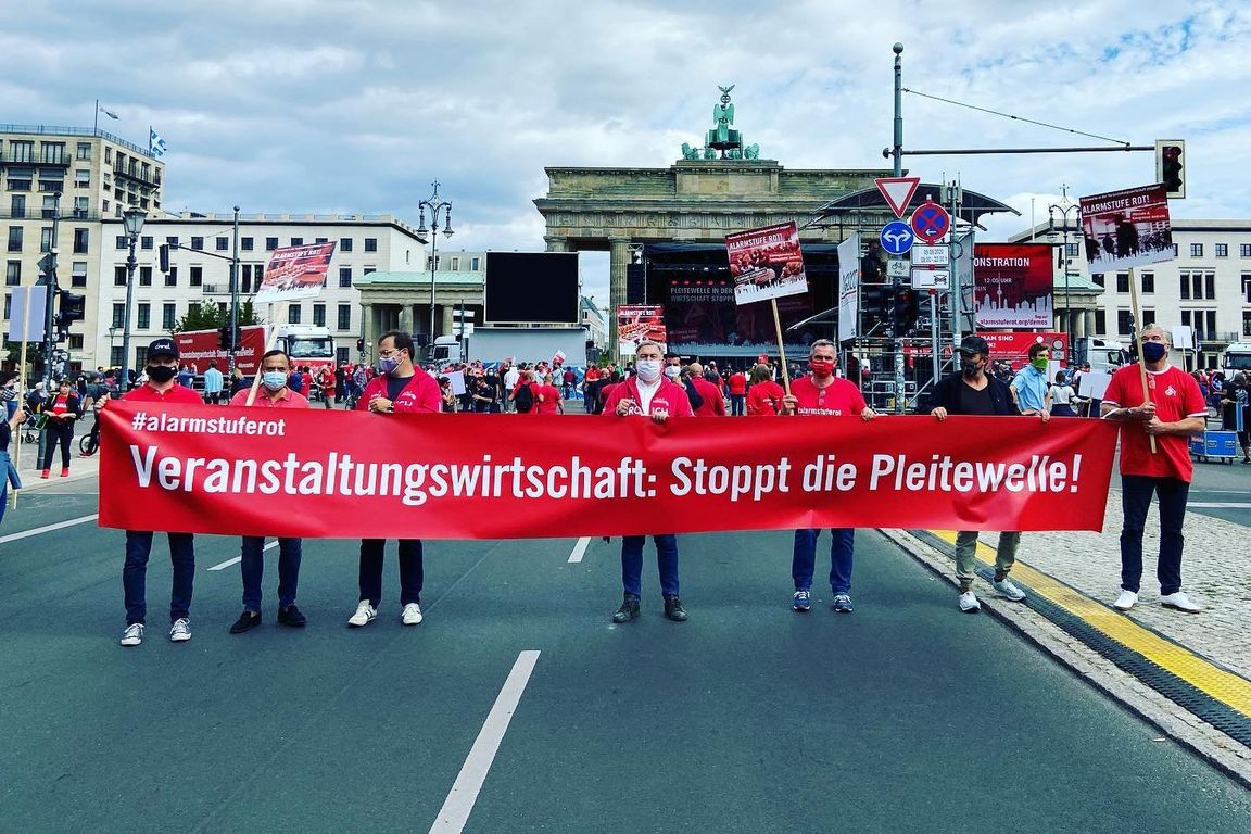 Ob Konzert, Kongress, Messe oder Kirmes: Das Aus für Tausende Veranstaltungen in der Corona-Krise hat die Branche in eine tiefe Krise geführt. Unternehmer und Beschäftigte sind deshalb am Mittwoch in Berlin auf die Straße gegangen. Unter dem Motto «#AlarmstufeRot» verlangten sie Gespräche über finanzielle Hilfe. Rund 6500 Menschen zogen nach Polizeiangaben durch das Regierungsviertel. Außerdem fuhr ein Korso mit rund 500 Fahrzeugen durch Berlin. Gemeinsames Ziel war das Brandenburger Tor.