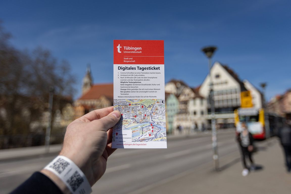 Menschen in Tübingen können sich seit dem 16. März an mehreren Stationen kostenlos testen lassen - mit den Bescheinigungen der Ergebnisse, den Tagestickets, können sie dann in Läden, zum Friseur oder auch in Theater und Museen gehen. Wegen großen Andrangs von außerhalb sind die Tests inzwischen auf Menschen aus dem Kreis Tübingen beschränkt.