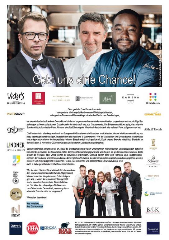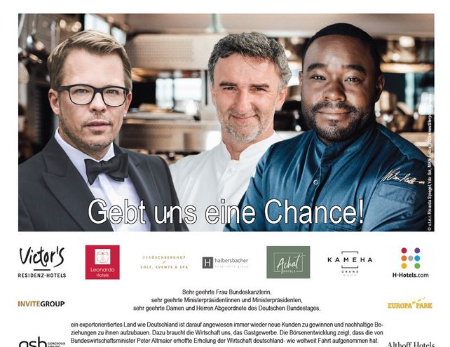 In der letzten Woche brachten mittelständische Hotelgruppen bei einer Pressekonferenz ihre Forderungen an die Politik zum Ausdruck. Nun folgen ganzseitige Zeitungsanzeigen in "Welt" und FAZ, in denen mit den Gesichtern von bekannten Köchen, ein Ausgleich für das „Sonderopfer“ der Branche gefordert wird.