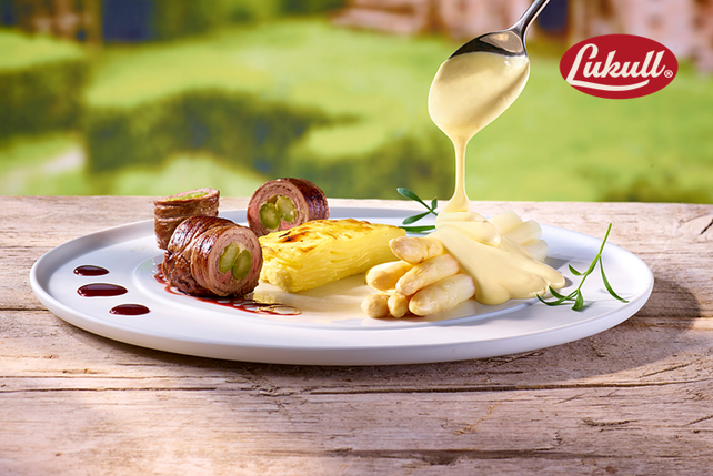 Ein Rezept ganz nach unserem Geschmack: Knackiger Spargel, dazu ein krosses Gratin und eine zarte Steakhuft-Roulade. Was darf nicht fehlen? Die cremige Sauce Hollandaise von Lukull!