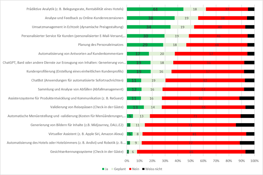 Technologien für Echtzeit-Revenue-Management und Personaleinsatzplanung belegen den Wunsch vieler Akteure zu betrieblicher Effizienz und dynamischer Preisgestaltung. Erste Betriebe haben bereits in Innovationen wie automatisierte Kundenantworten und Kundenprofilierung investiert, was einen wachsenden Trend zur Automatisierung und personalisierten Gästekommunikation in der Branche zeigt. Fortgeschrittene Technologien wie Gesichtserkennung und Hotelautomation befinden sich jedoch noch in der Entwicklungsphase.