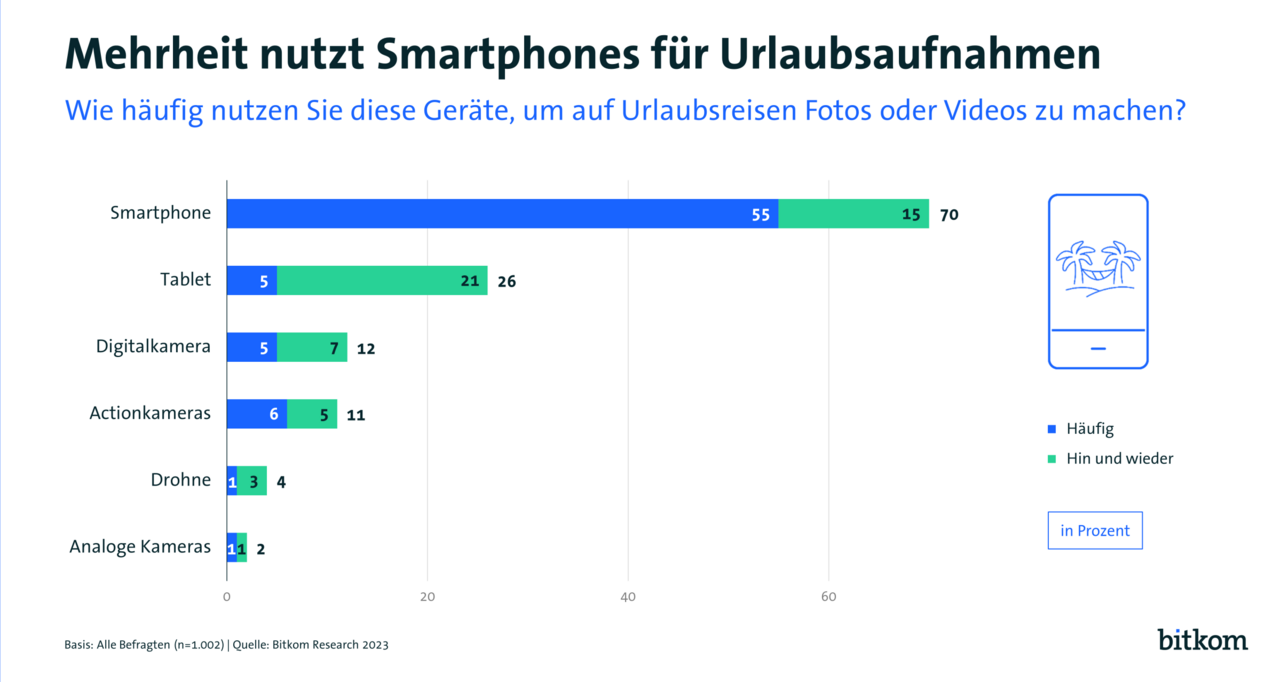 70 Prozent der Deutschen nutzen ein Smartphone, um auf Urlaubsreisen Fotos und Videos zu machen. Davon kommt es bei 55 Prozent häufig zum Einsatz, bei 15 Prozent hin und wieder. Auch ein Tablet nutzen insgesamt 26 Prozent für ihre Urlaubsaufnahmen, davon allerdings nur 5 Prozent häufig sowie 21 Prozent hin und wieder. Das sind Ergebnisse einer repräsentativen Befragung im Auftrag des Digitalverbands Bitkom unter 1.002 Personen in Deutschland ab 16 Jahren.