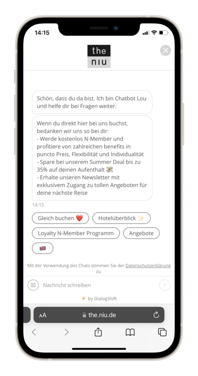„Durch das Dialogmarketing lässt sich die Online Conversion signifikant erhöhen. Wir verzeichnen mit dem Chatbot eine Konvertierungsrate von bis zu 33 Prozent, was im Endeffekt mehr Direktbuchungen bedeutet“, führt Olga Heuser, Gründerin und Geschäftsführerin von DialogShift, aus. Auch für die Mitarbeitenden bringe der Einsatz des Bots einige Vorteile mit sich. Der Chatbot unterstütze den persönlichen Service und übernehme rund 90 Prozent der Gästeanfragen. Dazu gehören vor allem die immer wiederkehrenden Fragen nach Parkplätzen, Öffnungszeiten der Restaurants, Tischreservierungen, Wellnessanwendungen und natürlich Buchungsanfragen. Rund 200 solcher Fragestellungen und passende Antworten dazu kennt die KI bereits.