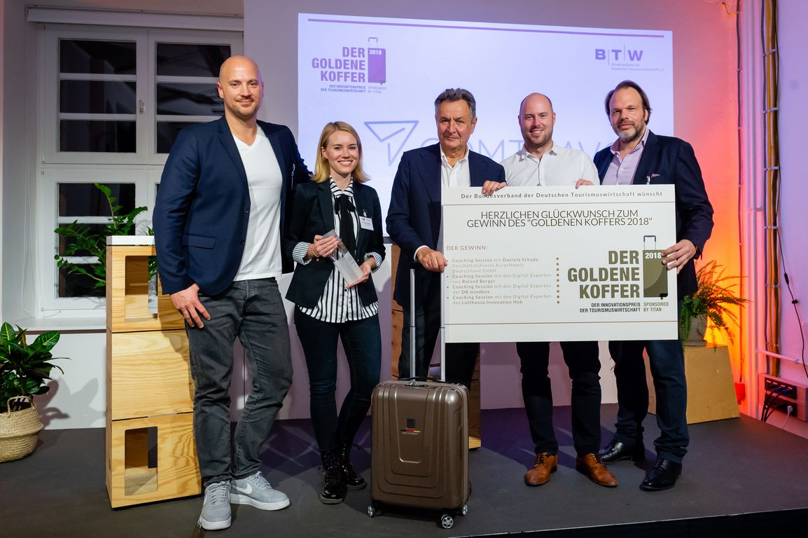 Der Gewinner des „Goldenen Koffer 2018“ des Bundesverbands der Deutschen Tourismuswirtschaft (BTW) heißt Comtravo: Am Sonntagabend setzte sich das auf das Buchen von Geschäftsreisen spezialisierte Start-Up Comtravo gegen seine vier Mitstreiter Hotelshop.one, MountLytics, Strandbutler und Unplanned im finalen Pitch im Digital Hub Spielfeld von Roland Berger in Berlin durch. Neben einer überzeugenden Präsentation begründete die Jury die Entscheidung für Comtravo vor allem mit der Skalierbarkeit des Geschäftsmodells und der Anwendbarkeit der Geschäftsidee des Start-ups in weiten Teilen der Tourismuswirtschaft.