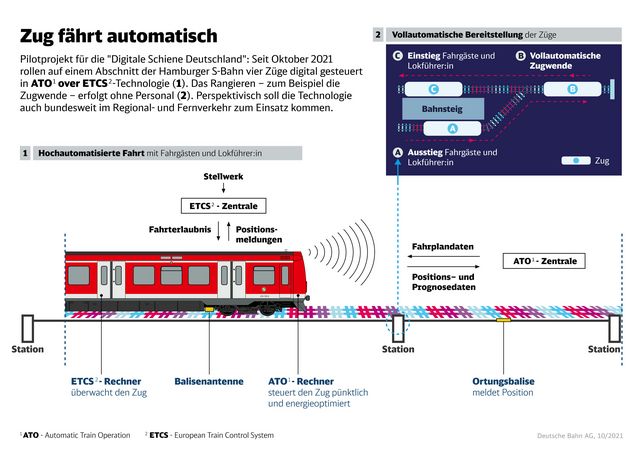 Technische Basis für den digitalen Bahnbetrieb ist der künftige europäische Standard ATO (Automatic Train Operation) kombiniert mit dem europäischen Zugsicherungssystem ETCS (European Train Control System). Die Züge erhalten die Steuerungssignale über Funk. Ab Dezember fahren die vier digitalen S-Bahnen in Hamburg im fahrplanmäßigen Einsatz. Die Planungen zur Ausstattung der S-Bahn Hamburg bis Ende des Jahrzehnts laufen bereits, Investitionen in Züge und Infrastruktur sind gestartet. Perspektivisch soll die Technologie auch bundesweit im Regional- und Fernverkehr genutzt werden.