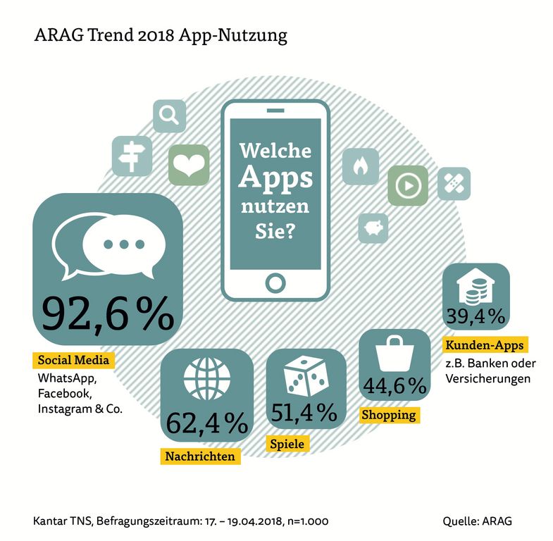 Es gibt sie erst seit etwa zehn Jahren und trotzdem kann sich kaum einer vorstellen, wie das Leben ohne sie war. Die Rede ist von Mini-Anwendungen für Mobiltelefone, auch Applications oder kurz Apps genannt. Hierzulande sind Apps sogar so beliebt, dass die Deutschen zu den aktivsten Nutzern in Europa gehören. Im Rahmen ihrer allgemeinen Markt- und Gesellschaftsforschung wollte die ARAG SE genauer wissen, wer welche Anwendung am liebsten nutzt. Gemeinsam mit dem Meinungsforschungsinstitut Kantar TNS wurden dazu 1.000 Deutsche befragt. Das repräsentative Ergebnis: Apps gehören für die ganz große Mehrheit der Deutschen zum Alltag, aber Geld ausgeben wollen sie dafür eher nicht.