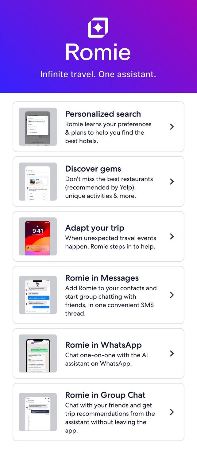 Die Expedia Group hat auf der Explore, der jährlichen Partnerkonferenz in Las Vegas, neue Produkte und Funktionen vorgestellt. So zum Beispiel den KI-Assistenten "Romie". Dieser assistiert bei der Planung, beim Einkaufen und bei der Buchung und greift unter die Arme, wenn sich während der Reise etwas unerwartet ändert. Die Alpha-Version ist derzeit bei EG Labs, einem Zentrum für experimentelle Produkte, verfügbar.