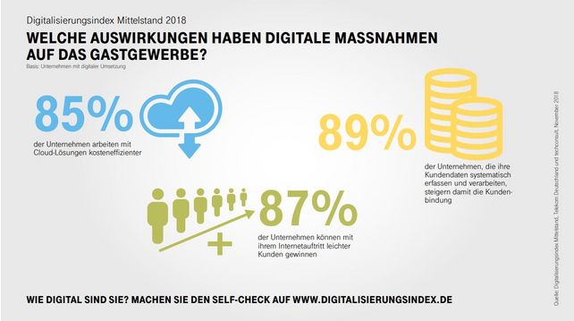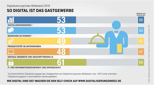 Leicht gesteigert, aber immer noch unter Durchschnitt. Der „Digitalisierungsindex Mittelstand 2018“ stellt dem Gastgewerbe ein mittelmäßiges Zeugnis aus. Die Studie wurde von der Deutschen Telekom in Auftrag gegeben und lädt zum Selbsttest ein. Die Sudie kann hier heruntergeladen werden.