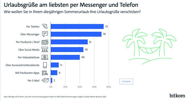 Trotzdem ist aber auch der Klassiker der Urlaubspost noch längst nicht tot: 51 Prozent derjenigen, die dieses Jahr einen Sommerurlaub geplant haben, wollen ihre Urlaubsgrüße per Postkarte oder Brief verschicken. Unter den 16- bis 29-Jährigen greifen mit 50 Prozent sogar ähnlich viele noch zum Stift wie unter den ab 65-Jährigen (55 Prozent). Das sind Ergebnisse einer Befragung im Auftrag des Digitalverbands Bitkom unter 1.002 Personen in Deutschland ab 16 Jahren, darunter 639, die in diesem Jahr einen Sommerurlaub geplant haben.