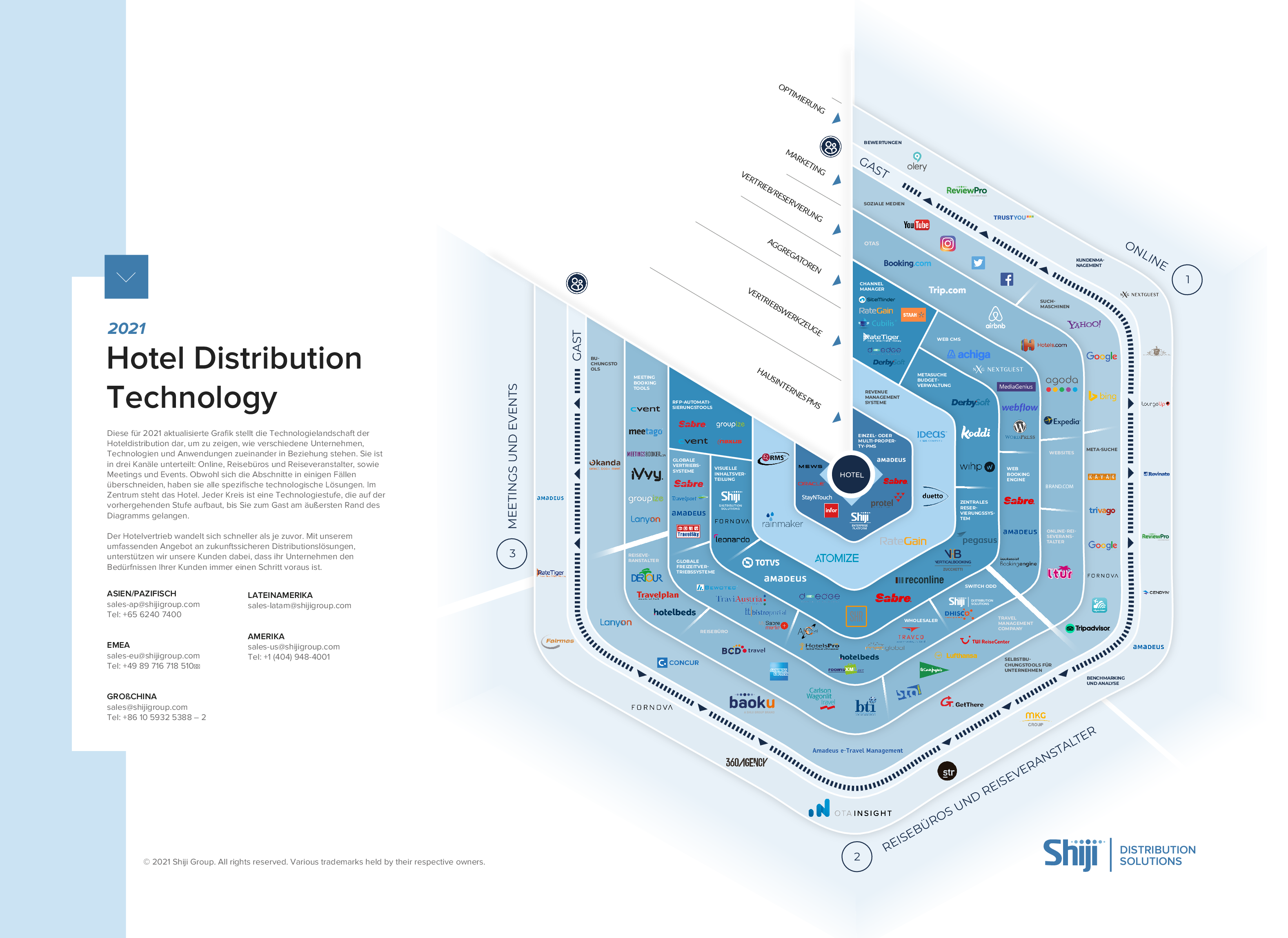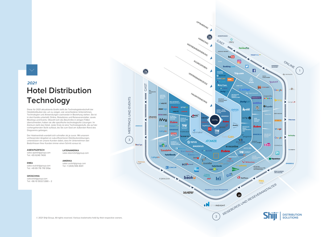 Der Shiji Hotel Technology Distribution Chart dient dabei als Hilfsmittel, um die aktuelle Hotel- und Gastgewerbetechnologie-Bandbreite zu visualisieren. Er zeigt die verschiedenen Anbieter und ihre Beziehungen zum Hotel, zum Gast und untereinander. Um einen tieferen Einblick in die Technologiepartner, Anbieter und Wettbewerber auf dem Markt zu bekommen, wandte sich das Team von Shiji Insights während ihrer Recherche an Shiji Distribution Solutions, welche jahrzehntelange Erfahrung in diesem Bereich haben.