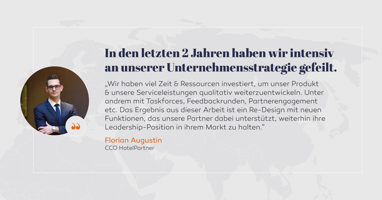 „Das war für uns sehr wichtig, damit wir diesen großen Entwicklungsschritt bestmöglich gestalten können. Außerdem haben wir ausgewählte Projektpartner für Design und Development eingebunden – so können wir für die Weiterentwicklung auf das größtmögliche Wissen aller Beteiligten setzen. Wir sind stolz auf die neue Arbeitsweise der Task Force und die Zusammenarbeit mit den Hoteliers, das war bislang sehr erfolgsversprechend. Jeder hat sich mit vollem Einsatz am Gelingen dieses Projektes beteiligt, dafür möchten wir unseren Dank aussprechen,“ resumiert Florian Augustin, CCO HotelPartner.