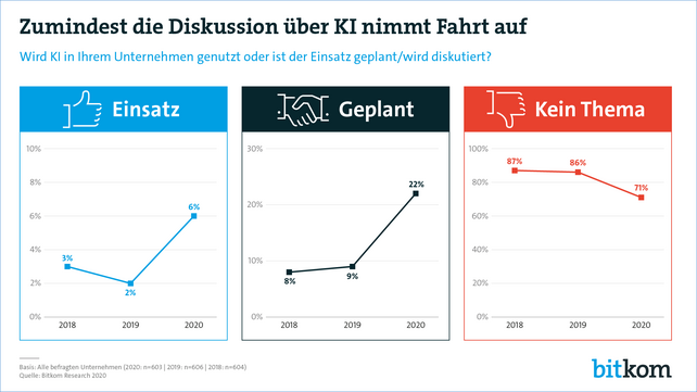 Die Unternehmen sprechen der Künstlichen Intelligenz eine herausragende Bedeutung zu, tun sich aber schwer damit, die Technologie praktisch einzusetzen. So sind etwa drei Viertel (73 Prozent) der Unternehmen mit 20 oder mehr Mitarbeitern in Deutschland der Meinung, KI sei die wichtigste Zukunftstechnologie. Aber gerade einmal 6 Prozent setzen KI selbst ein, lediglich jedes Fünfte (22 Prozent) plant die KI-Nutzung oder diskutiert darüber.