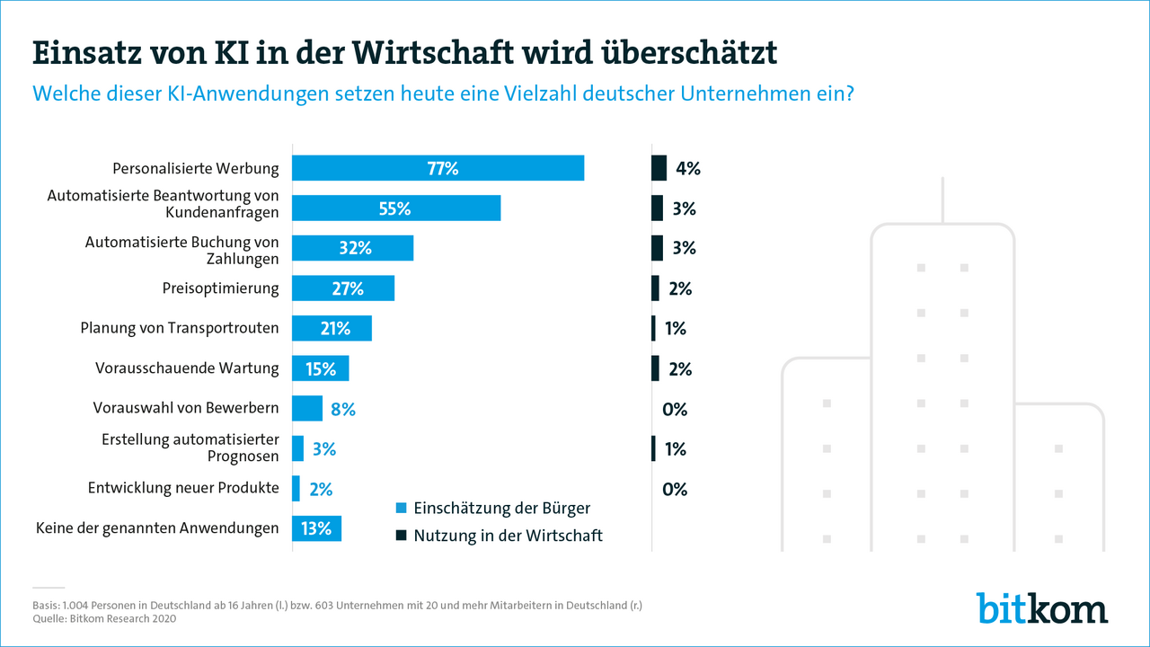 Die Menschen überschätzen stark, wie intensiv Künstliche Intelligenz von Unternehmen eingesetzt wird. Das zeigt eine aktuelle Studie im Auftrag des Digitalverbands Bitkom, für die 1.004 Personen in Deutschland ab 16 Jahren repräsentativ befragt wurden. Demnach gehen rund drei Viertel der Verbraucher (77 Prozent) davon aus, dass personalisierte Werbung mit KI-Hilfe bereits heute von einer Vielzahl von Unternehmen eingesetzt wird. Tatsächlich aber nutzen erst 4 Prozent der Unternehmen entsprechende Lösungen. Auch glaubt mehr als jeder zweite Bundesbürger (55 Prozent), dass mit KI-Hilfe weit verbreitet Kundenanfragen beantwortet werden, dabei setzen dies erst 3 Prozent der Unternehmen ein.