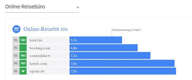 Für die Reisebranche bietet das Online-Reisebüro Hotel.de mit 3,7 Sekunden die schnellste mobile Webseite, gefolgt von Booking. Mit Abstand folgen die Domains traumferienwohnungen.de mit 4,5 Sekunen in der Kategorie „Unterkünfte“ und holidu.de mit 4,6 Sekunden in der Kategorie „Vergleichsportale“.