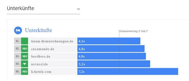 In der Kategorie Unterkünfte finden sich ansonsten nur Portale für Ferienwohnungen. Das bedeutet, das es keine mobile Webseite in der Hotellerie auch nur im Ansatz schafft die Erwartungen der Verbraucher zu erfüllen. Denn 53 Prozent der Nutzer brechen ab, wenn die Ladezeit mehr als drei Sekunden beträgt.