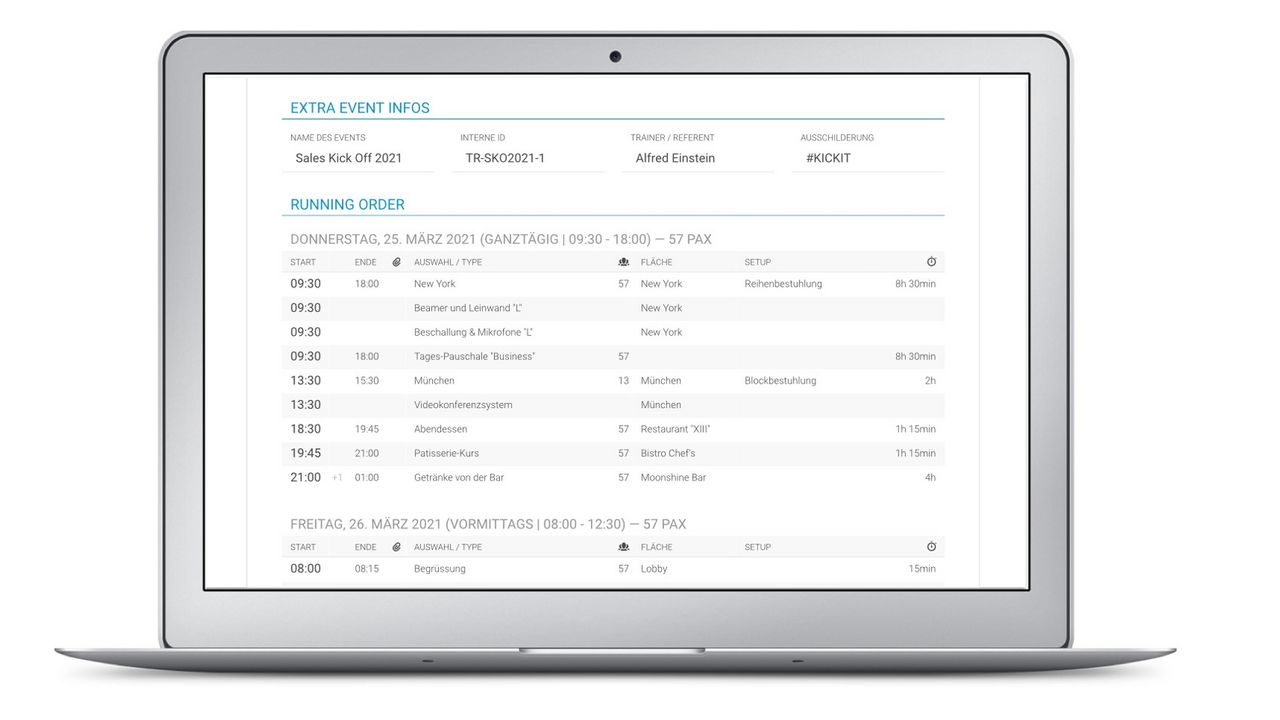 Zeitpläne für Veranstaltungen werden, basierend auf den Event-Konfigurationen und Angeboten automatisiert erstellt. Last-Minute-Änderungen an einer Veranstaltung werden sofort in alle Unterlagen übernommen. Zur Abstimmung können Ablaufpläne und Function Sheets sofort per Mausklick mit anderen Teammitglieder oder Kunden geteilt werden.