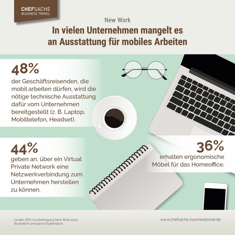Die Corona-Pandemie hat dem mobilen Arbeiten zum Durchbruch verholfen. Doch noch heute mangelt es in etlichen Unternehmen an der dafür notwendigen Ausstattung. Nur jeder zweite Geschäftsreisende mit Möglichkeit zum mobilen Arbeiten ist in einer Firma tätig, die technisches Equipment wie Laptop, Mobiltelefon oder Headset dafür zur Verfügung stellt. 50 Prozent haben auch keinen Zugriff auf digitale Tools oder Software, um mit Kolleginnen und Kollegen online zu kommunizieren oder digital zusammenzuarbeiten. Das geht aus der regelmäßig seit zehn Jahren durchgeführten Studie „Chefsache Business Travel“ hervor, einer Initiative von Travel Management Companies im Deutschen Reiseverband (DRV).