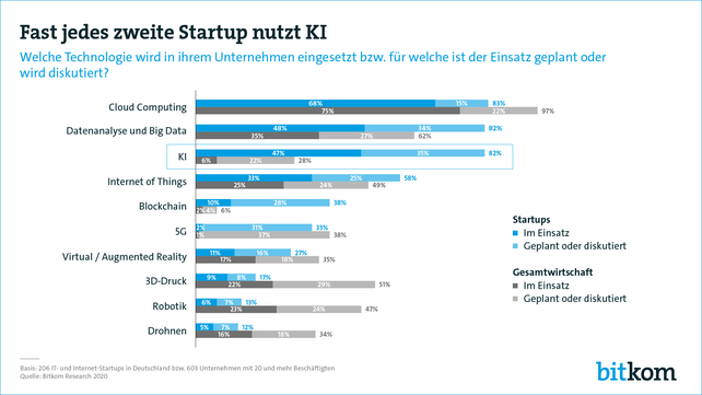 Schon bald könnte Künstliche Intelligenz zu einer Standard-Technologie in Startups gehören. Aktuell gibt fast jedes zweite Startup in Deutschland (47 Prozent) an, KI einzusetzen. Darüber hinaus plant mehr als jedes Dritte (35 Prozent) den Einsatz oder diskutiert darüber. Das ist das Ergebnis einer Umfrage im Auftrag des Digitalverbands Bitkom unter 206 Startups. Zum Vergleich: Vor einem Jahr hatten erst 39 Prozent der Startups KI im Einsatz, 38 Prozent wollten sich damit beschäftigen. In der Gesamtwirtschaft nutzen gerade einmal 6 Prozent der Unternehmen ab 20 Mitarbeitern KI-Technologien, weitere 22 Prozent beschäftigen sich damit.