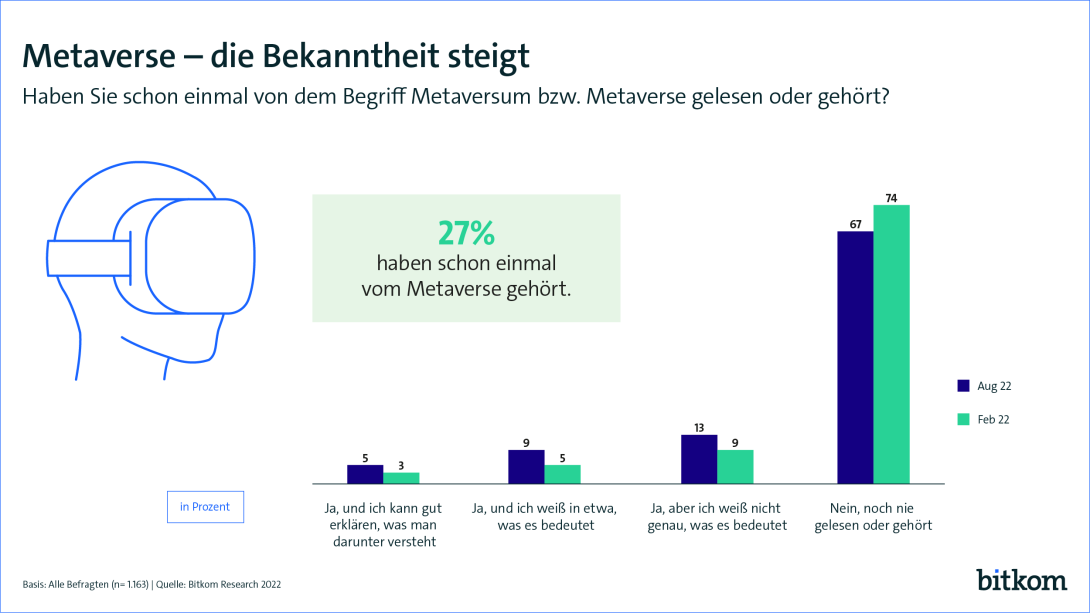 Die Bekanntheit dieses Konzepts steigt: Bereits ein gutes Viertel der Deutschen (27 Prozent) hat bereits vom Begriff Metaverse gehört – im Februar dieses Jahres waren es noch 17 Prozent. 13 Prozent haben den Begriff schon einmal gehört, wissen aber nicht genau, was das eigentlich ist, weitere 9 Prozent können zumindest in etwa sagen, was er bedeutet. Immerhin jeder und jede Zwanzigste (5 Prozent) traut sich zu, erklären zu können, worum es beim Metaverse geht.