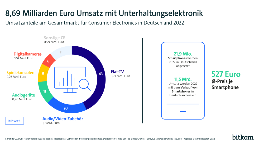 Die Umsätze mit klassischer Unterhaltungselektronik und sogenannter Consumer Technology entwickeln sich in Deutschland leicht rückläufig, könnten durch das Metaverse jedoch neu beflügelt werden. Auch das Interesse an Technologien wie Augmented Reality und digitalen Sprachassistenten wächst. Aktuellen Prognosen des Digitalverbands Bitkom zufolge wird der Umsatz mit Consumer Technology in diesem Jahr voraussichtlich rund 8,7 Milliarden Euro betragen (2021: 8,9 Mrd. Euro, 2020: 9,3 Mrd. Euro).