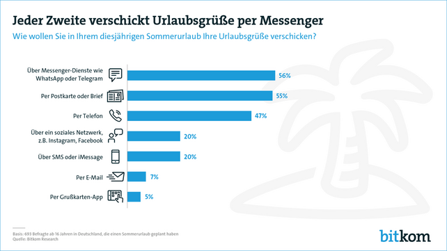 Ob am Strand auf Ibiza, am Badesee in den Alpen oder beim Roadtrip durch Südostasien: 9 von 10 Deutschen (87 Prozent), die in diesem Jahr in den Sommerurlaub fahren, wollen von dort aus Grüße an Familie und Freunde in der Heimat verschicken – und das zunehmend digital. Mehr als jeder Zweite (56 Prozent) nutzt dafür Messenger wie WhatsApp oder Telegram. 20 Prozent wollen ihre Urlaubsgrüße bei der Foto-Plattform Instagram oder in einem anderen sozialen Netzwerk wie Facebook oder Twitter posten. Weitere 20 Prozent nutzen die klassische SMS, 7 Prozent schreiben E-Mails. Das hat eine repräsentative Umfrage des Digitalverbandes Bitkom unter 1.003 Bundesbürgern ab 16 Jahren ergeben.
