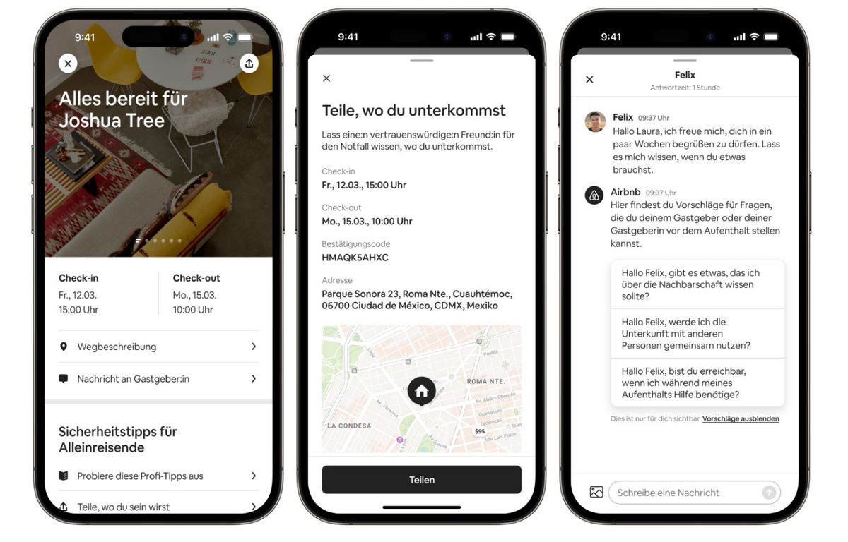 Wenn ein Solo-Gast ein privates oder geteiltes Zimmer auf Airbnb bucht, wird das spezielle In-App-Erlebnis aktiviert. Dazu zählen drei wichtige Funktionen: