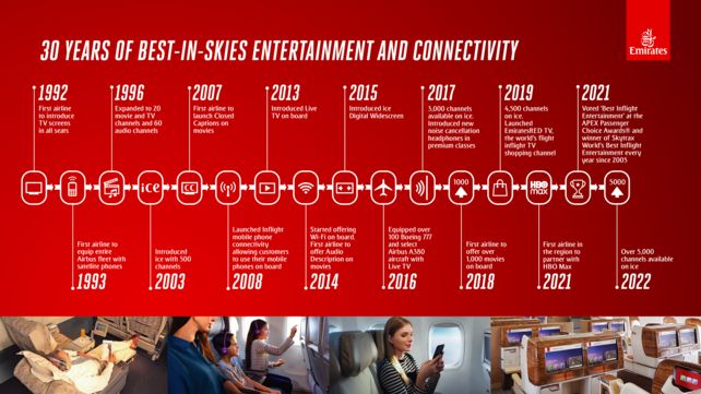 Vor 30 Jahren, im Jahre 1992, traf Emirates die Entscheidung, auf seiner kompletten Flugzeugflotte alle Sitze in allen Beförderungsklassen mit individuellen TV-Bildschirmen auszustatten. Damit setzte Emirates als Vorreiter für die kommenden Jahrzehnte neue Maßstäbe im Bereich Inflight Entertainment (IFE).