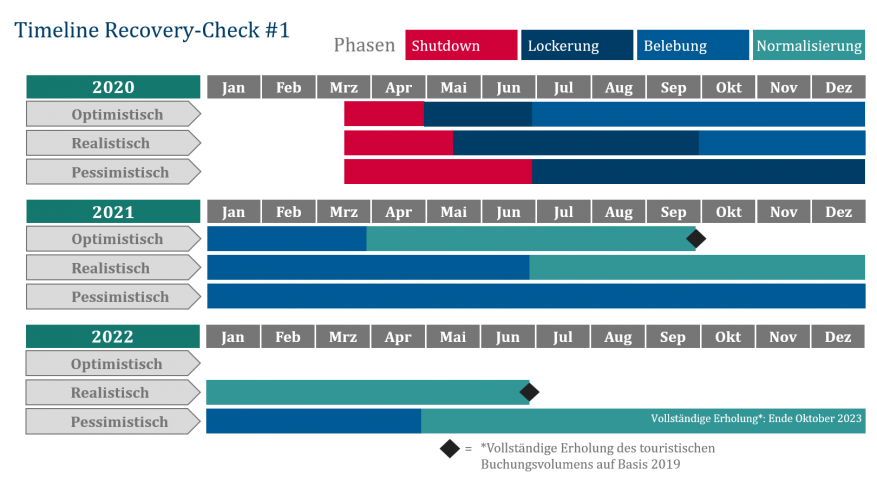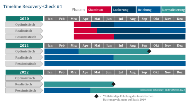 In der optimistischen Betrachtung wird die Normalisierung mit der Ostersaison 2021 einsetzen. Die deutsche Tourismuswirtschaft könnte dann bereits im September 2021 den Stand des Basisjahres 2019 erreichen. Zum jetzigen Zeitpunkt jedoch erscheint die dafür notwendige flächendeckende Verfügbarkeit eines Impfstoffes und der weitgehende Abbau von Reisebeschränkungen erst im Sommer 2021 wahrscheinlich. Folglich würde sich die deutsche Tourismuswirtschaft erst bis zum Sommer 2022 wieder vollständig erholen können.