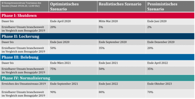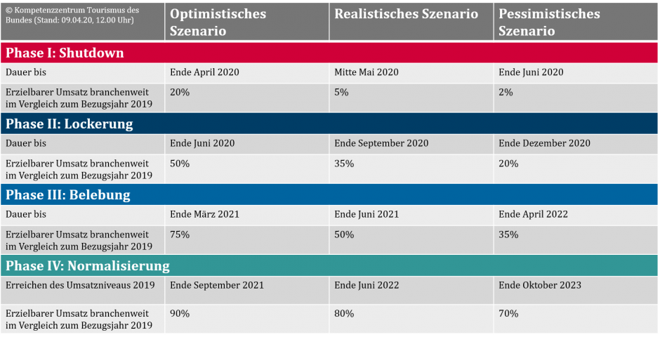 Der „Recovery-Check“ untersucht die Erholungspotentiale für die Tourismuswirtschaft in Deutschland in ihrer Gesamtheit. Das Kompetenzzentrum Tourismus des Bundes geht davon aus, dass die aktuell bestehenden Restriktionen und Reiseeinschränkungen frühestens ab Ende April, wahrscheinlicher ab Ende Mai, schrittweise gelockert werden. Je nach Länge des bestehenden Shutdowns werde in dieser Phase damit gerechnet, dass, verglichen zum Vorjahr, nur zwischen zwei und 20 Prozent der Umsätze branchenweit erzielt werden können.