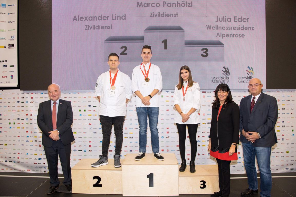 Die Top Platzierung in Bereich „Restaurant Service“ ging an Michaela Ehgartner (KTN) vom Parkhotel Pörtschach, dicht gefolgt von Johannes Aistleithner (OÖ) aus dem Hotel Alpenhof Hintertux. Im Bereich „Hotel Rezeption“ schaffte es Oliver Lang (W) aus dem Mercure Vienna First sich vor seiner Konkurrentin Caroline Schiffer (OÖ) vom Park Inn by Radisson Linz den Sieg zu holen. Auch im Bereich „Cook“ gab es einen heißen Kampf an den Töpfen und Pfannen, wo sich Marco Panhölzl (OÖ) vor Alexander Lind (STMK) durchsetzen konnte.
