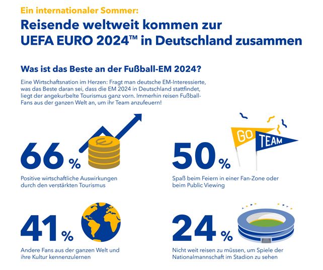 Laut der Umfrage sind zwei Drittel (66 %) der Befragten der Meinung, dass die positiven wirtschaftlichen Auswirkungen durch den verstärkten Tourismus das Beste daran sind, dass die EM in Deutschland stattfindet. Bei denjenigen, die in einem der zehn deutschen Austragungsorte leben, ist diese Zahl etwas höher (70 %). Die Freude, die das Turnier mit sich bringt, ist ebenfalls ansteckend: Die Hälfte (50 %) der EM-Interessierten findet den Spaß beim Feiern in einer Fan-Zone oder beim Public Viewing am besten, gefolgt von 41 %, die sagen, andere Fans aus der ganzen Welt und ihre Kultur kennenzulernen, sei das Beste.