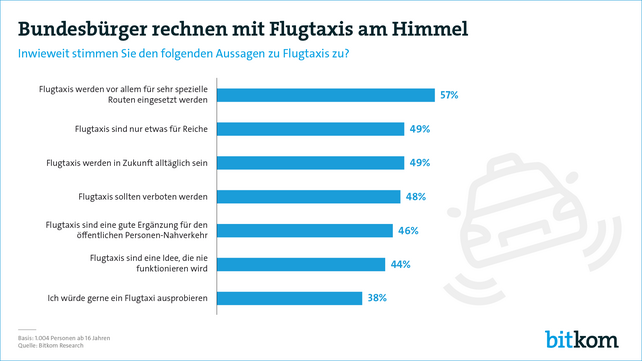 Andererseits gehen 49 Prozent aller Bundesbürger davon aus, dass Flugtaxis in Zukunft alltäglich sein werden. Das ist das Ergebnis einer repräsentativen Umfrage unter 1.004 Bundesbürgern ab 16 Jahren im Auftrag des Digitalverbands Bitkom. „Technisch sind wir bereits in der Lage, autonome Fluggeräte zu bauen, die auch Menschen transportieren können. Ob daraus wirklich Flugtaxis werden, hängt weniger von technischen als vielmehr von rechtlichen Fragen ab - etwa der Benutzung des Luftraums in dicht besiedelten Gebieten“, sagt Bitkom-Präsident Achim Berg. „Mobilitätsunternehmen sollten die Entwicklung genau verfolgen.“