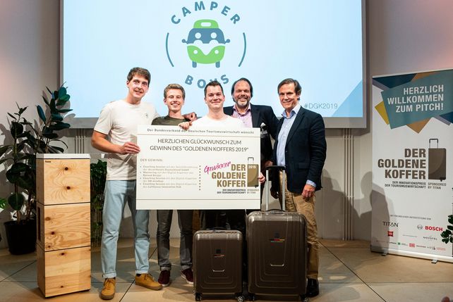 CamperBoys hat die Jury überzeugt und den „Goldener Koffer 2019“ - den Innovationspreis der Tourismuswirtschaft sponsored by Titan - gewonnen: Am Dienstagabend setzte sich das auf die Vermietung und den Verkauf von Campingbussen spezialisierte Start-up im finalen Pitch des vom Bundesverband der Deutschen Tourismuswirtschaft ausgelobten Preises durch.