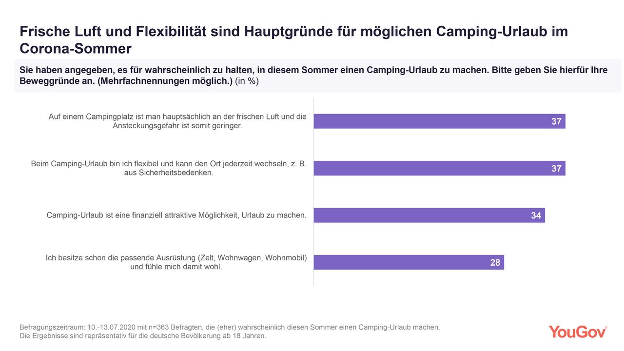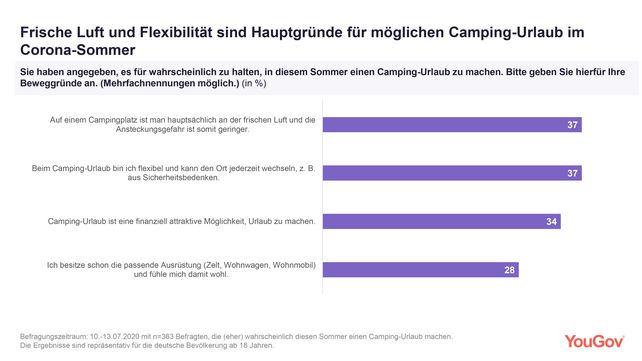 Unter jenen, die einen Camping-Urlaub im Sommer 2020 für wahrscheinlich halten, geben 37 Prozent als Hauptgrund die geringere Ansteckungsgefahr auf einem Campingplatz an, da man an der frischen Luft sei. Weitere 37 Prozent sagen, dass sie beim Camping flexibel seien und bei Sicherheitsbedenken jederzeit den Ort wechseln könnten. Für 34 Prozent ist Camping-Urlaub eine finanziell attraktive Möglichkeit Urlaub zu machen. Und 28 Prozent geben als Grund an, schon die passende Ausrüstung zu besitzen und sich damit wohlzufühlen.