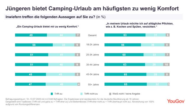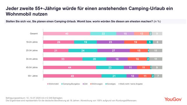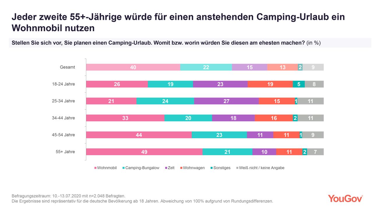 Die Mehrheit der Deutschen (58 Prozent) hat schon einmal einen Camping-Urlaub gemacht, 41 Prozent noch nicht. Falls sie einen Camping-Urlaub planen, würden die Befragten diesen am häufigsten (40 Prozent) in einem Wohnmobil erleben wollen, am zweithäufigsten in einem Camping-Bungalow (22 Prozent). 15 Prozent bevorzugen das Zelt und 13 Prozent den Wohnwagen. Jüngere Befragte im Alter von 25 bis 34 Jahren sagen am häufigsten (27 Prozent), den Urlaub im Zelt verbringen zu wollen. Unter Befragten ab 55 Jahren sagen dies 10 Prozent. Jene Altersgruppe bevorzugt am häufigsten das Urlauben im Wohnmobil (49 Prozent). Am seltensten machen die 25- bis 34-Jährigen (21 Prozent) diese Angabe.