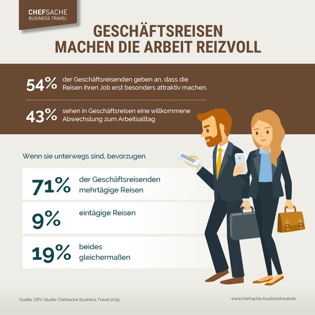 Öfter mal weg vom Schreibtisch: 54 Prozent der Dienstreisenden geben an, dass berufliche Fahrten zu Kunden oder Geschäftspartnern ihren Job attraktiv machen. Außerdem erwarten 39 Prozent dadurch mehr Umsatz. Das sind Ergebnisse der aktuellen Umfrage „Chefsache Business Travel 2019“, einer Initiative von Travel Management Companies im Deutschen Reiseverband (DRV)