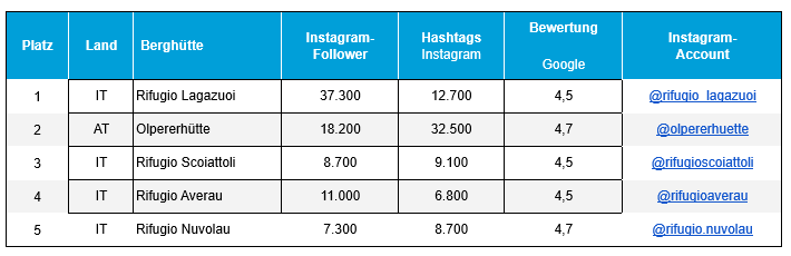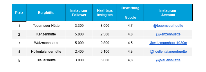 Tabelle 1: Top 5 der beliebtesten Berghütten in den bayerischen Alpen. Mehr Informationen zu dieser Untersuchung mit allen Ergebnissen für 100 untersuchte Berghütten sowie einer ausführlichen Erklärung der Methodik mit allen Quellen findet sich unter: www.holidaytrex.com/the-best-mountain-huts.p729.de.html