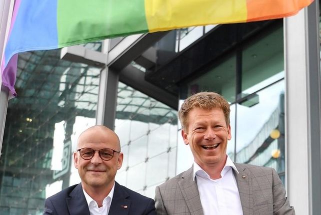 Aus Anlass der diesjährigen Pride Week haben DB-Chef Richard Lutz und DB-Personalvorstand Martin Seiler am Berliner Hauptbahnhof die Regenbogenflagge gehisst. „Wir wollen damit zeigen: Die DB ist bunt - und wir sind überzeugt, dass diese Vielfalt uns hilft, die Bahn stark zu machen“, erklärte Lutz. Das Symbol der Lesben, Schwulen, Bisexuellen und Transgender wird zwei Wochen lang in Berlin und anderen Bahnhöfen wehen, zum Beispiel in Saarbrücken, Kiel, Rostock, Darmstadt, Wiesbaden, Frankfurt und Essen.