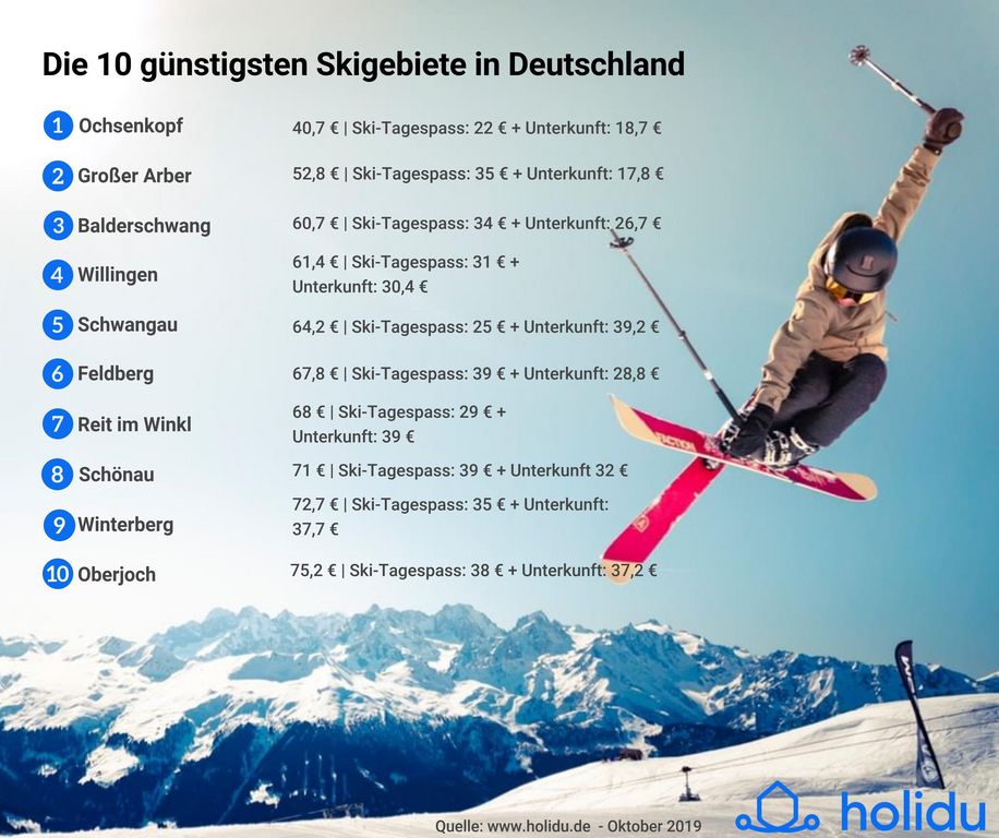 Wer für seinen Skiurlaub nicht viel Geld ausgeben möchte, sollte den Ochsenkopf im Fichtelgebirge ins Auge fassen. Unterkunft und Skipass kosten zusammen nur etwa 40 Euro pro Person und Tag - sowohl in der Haupt- als auch in der Nebensaison. Dem Ochsenkopf auf dem Fuße folgt das Skigebiet am Großen Arber. Hier sind die Unterkünfte im Durchschnitt sogar günstiger, doch ist der Skipass 13 Euro teurer, weswegen die durchschnittlichen Gesamtausgaben pro Person pro Tag zwischen 53 (Hauptsaison) und 51 Euro (Nebensaison) betragen.