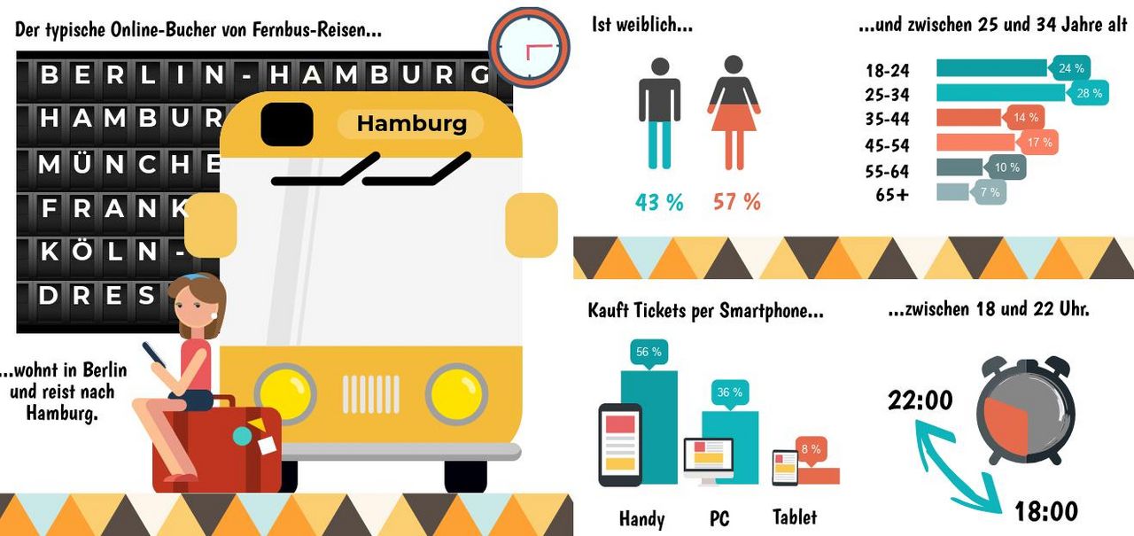 Laut einer Studie der internationalen Fernbus-Suchmaschine CheckMyBus ist der typische Online-Bucher von Fernbusreisen weiblich, im Alter von 25 bis 34 Jahren und wohnhaft in Berlin. Die Wahl des Reiseziels fällt typischerweise auf Hamburg und das Ticket wird in der Regel zwischen 18 und 22 Uhr per Smartphone gekauft.