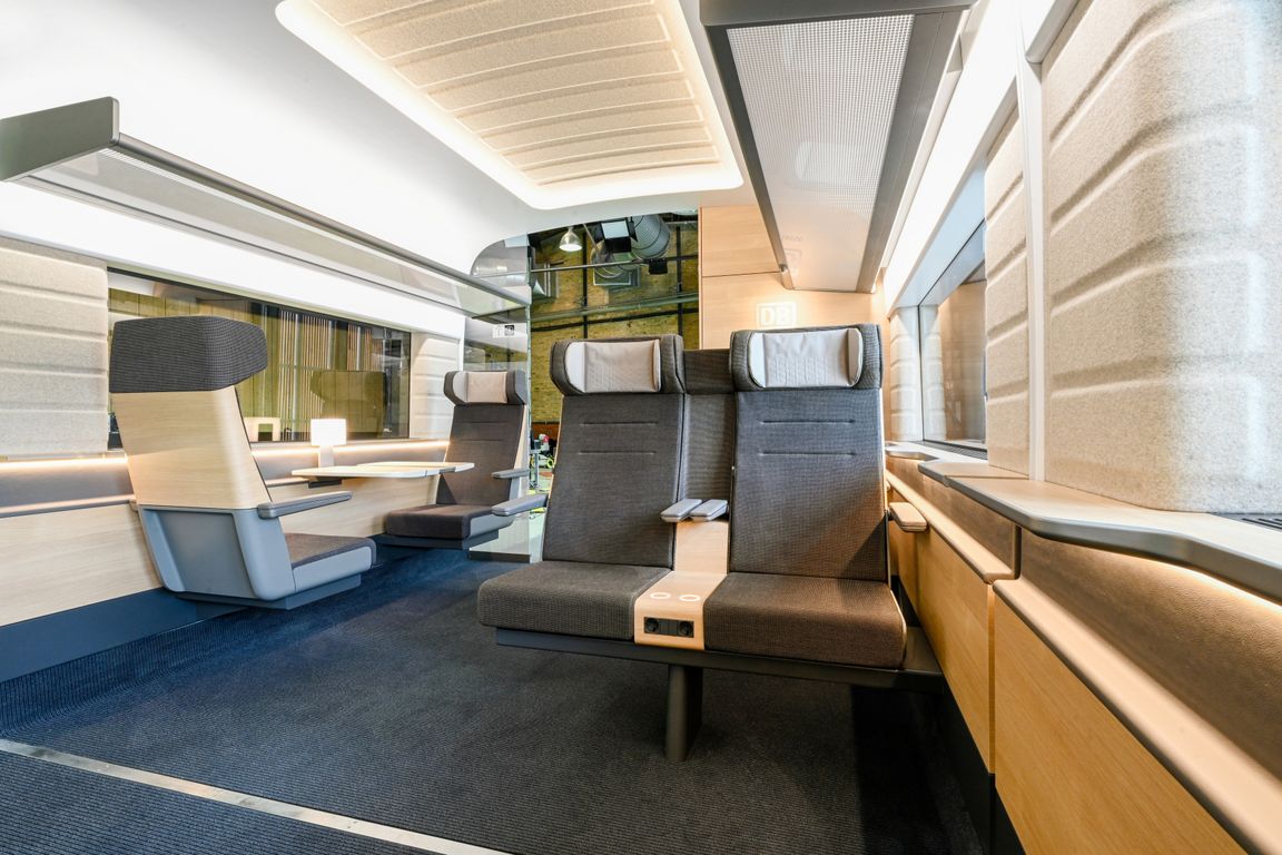 Die neuen Sitze sind als persönlicher Rückzugsort konzipiert: Eine harmonische Formgebung, moderne Materialien wie Holzdekor und Bezüge aus hochwertigem Gewebe mit 85 Prozent Wollanteil in nuancierten Farben bestimmen das neue Erscheinungsbild. Für die Sitzbezüge sind warme Grautöne in der 1. Klasse vorgesehen, Blautöne in der 2. Klasse und Burgundy im Bordrestaurant. Mehr Funktionalität bieten Elemente wie eine Tablet-Halterung oder Kleiderhaken in jeder Rückenlehne.