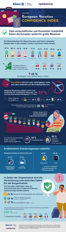 Der Sommer steht vor der Tür, und auch dieses Jahr beabsichtigen viele Deutsche trotz gestiegener Lebenshaltungs- und Reisekosten in der wärmsten Jahreszeit zu verreisen - und nehmen hierfür sogar deutliche Einsparungen im Alltag in Kauf, wie aus dem Allianz Partners International Travel Confidence Index hervorgeht. Im Rahmen der Studie befragte OpinionWay im Auftrag von Allianz Partners 9.300 Personen in neun europäischen Ländern nach ihren bevorstehenden Urlaubsplänen sowie den damit verbundenen Hürden und Wünschen.