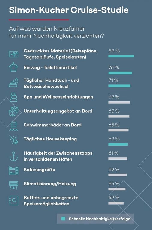 Für mehr Nachhaltigkeit im Rahmen von Kreuzfahrten sind Urlauber bereit, gewohnten Komfort und bestimmte Services aufzugeben. Rund jeder Zweite (49 Prozent) würde auf Buffets und unbegrenzte Speiseoptionen verzichten, noch mehr Menschen sogar auf Klimaanlagen (55 Prozent), Pools (65 Prozent) und Unterhaltungsangebote (68 Prozent).