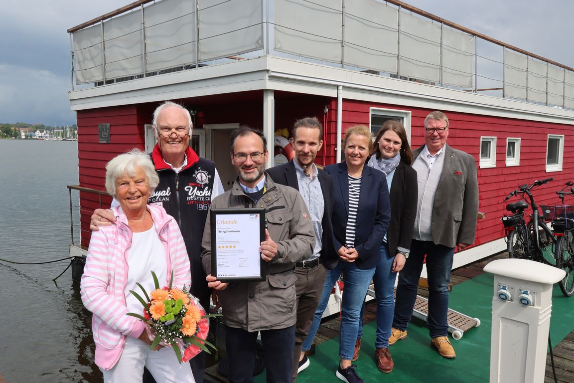 Die Ferienunterkunft „Flying Dutchman“ von Gastgeber Anton van Diem ist Deutschlands erstes Hausboot, das nach den neuen Kriterien des Deutschen Tourismusverbandes (DTV) mit 5 Sternen ausgezeichnet worden ist. Mit den neuen 90 Prüfkriterien der DTV-Klassifizierung können seit 2022 außergewöhnliche Ferienunterkünfte wie Hausboote, Tiny Houses oder Baumhäuser ausgezeichnet werden.