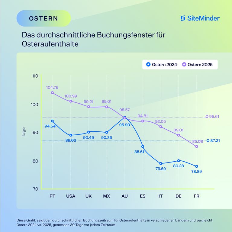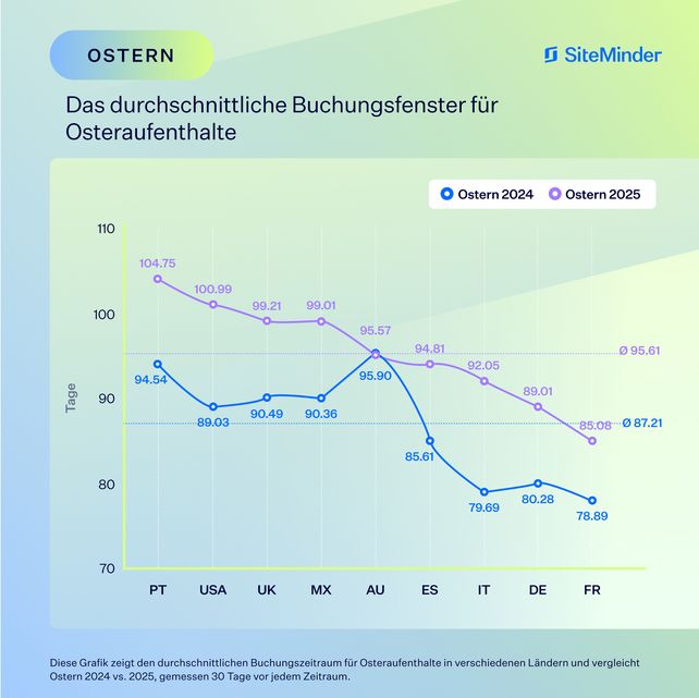 Einunddreißig Prozent der Osterbuchungen in Deutschland stammen von Reisenden aus dem Ausland, gegenüber 29 Prozent der Check-ins im letzten Jahr. Reisende sichern sich ihre Osteraufenthalte auch früher, da die durchschnittliche Vorlaufzeit für Buchungen auf 89 Tage gestiegen ist, ein Anstieg von 11 Prozent gegenüber 80 Tagen im Jahr 2024.