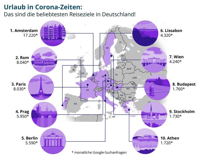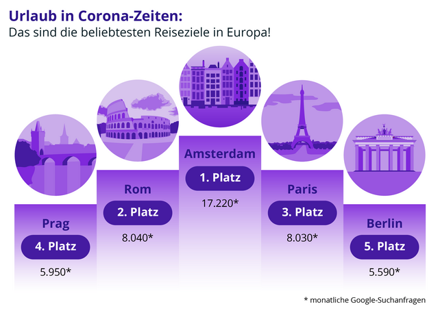 Seit Mitte Juni sind die Reisewarnungen für 29 EU-Länder wieder aufgehoben. Wer sich traut und die Corona-Beschränkungen beachtet, kann also durchaus auch einen sommerlichen Städteurlaub in Betracht ziehen. Die beliebtesten Städte für einen Kurztrip hat die Vergleich.org-Redaktion anhand der Google-Suchanfragen zusammengestellt.