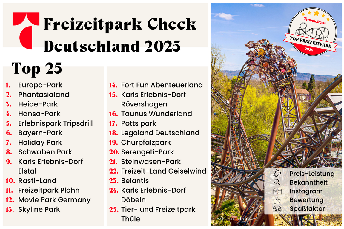 Mit über 60 Fahrgeschäften, 14 Achterbahnen und 792.000 Instagram-Posts bleibt der Europa-Park in Rust das Maß aller Dinge. Auf Platz zwei folgt das Phantasialand in Brühl mit seiner preisgekrönten Themenwelt Rookburgh. Dritter wird der Heide-Park in Soltau, der mit neun Achterbahnen ebenfalls hoch im Kurs steht.