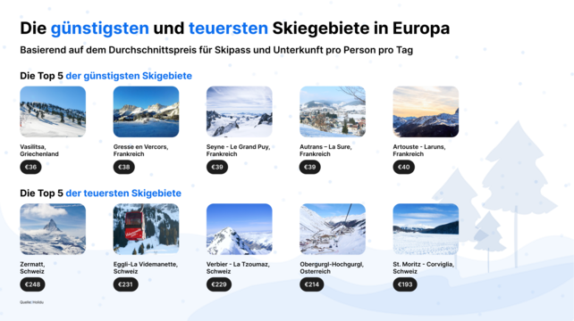 Wie jedes Jahr locken die Skigebiete in Europa Schneebegeisterte und Wintersport-Fans an. Der Skiurlaub wird laut Redaktionsnetzwerk Deutschland in diesem Jahr bis zu 20 Prozent teurer, doch abseits der namhaften Pisten lassen sich Schnäppchen machen - und entspannte Abfahrten genießen. Holidu, das Buchungsportal für Ferienhäuser, hat die Preise aller Skigebiete mit mehr als 20 Pistenkilometern für Europa und mehr als zehn Kilometern für Deutschland ausgewertet. Dafür wurde der durchschnittliche Preis pro Person und Tag während der Hoch- und Nebensaison sowohl für einen Skipass als auch für die Unterkunft recherchiert. Welche Skigebiete bieten also das beste Preis-Leistungs-Verhältnis und bei welchen sollten sich Skifahrer auf höhere Kosten einstellen?