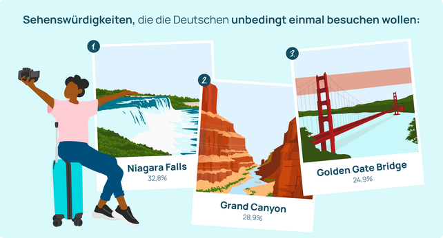Die Ergebnisse der Urlaubsguru-Umfrage zu diesem Thema sind spannend: Die drei beliebtesten Attraktionen der Deutschen befinden sich demnach alle in den USA. Platz eins belegen die beeindruckenden Niagara Falls im Norden der USA (mit 32,8 Prozent), gefolgt vom Grand Canyon ganz im Süden (28,9 Prozent) und der berühmten Golden Gate Bridge (24,9 Prozent), die San Francisco und Marin County miteinander verbindet.